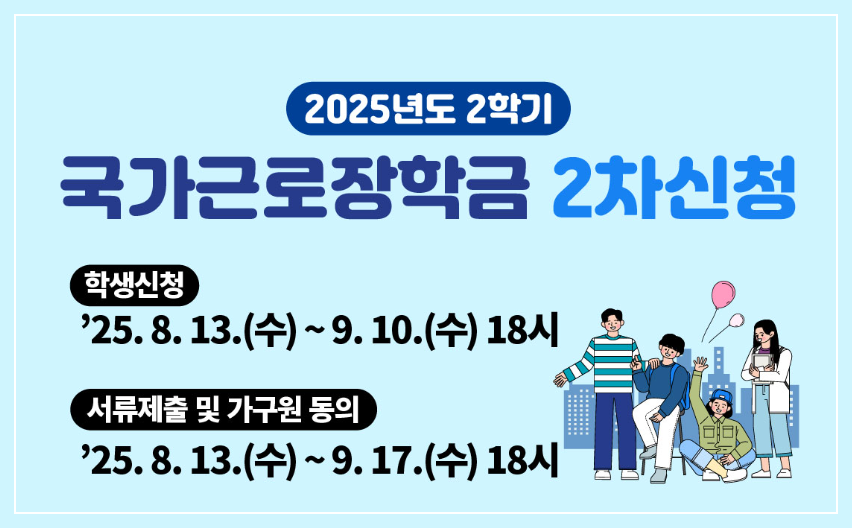 2025학년도 2학기 국가장학금 2차 신청은 2025년 8월 13일 오전 9시부터 9월 10일 오후 6시까지 진행됩니다. 신청은 한국장학재단 누리집과 모바일 애플리케이션을 통해 24시간 가능하며, 마감일인 9월 10일에는 오후 6시까지 신청이 가능합니다.