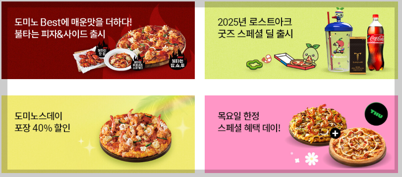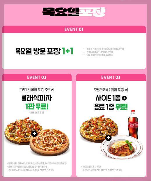 도미노피자에서는 목요일 방문포장 원플러스원 이벤트도 진행중이니 살펴보시기 바랍니다.