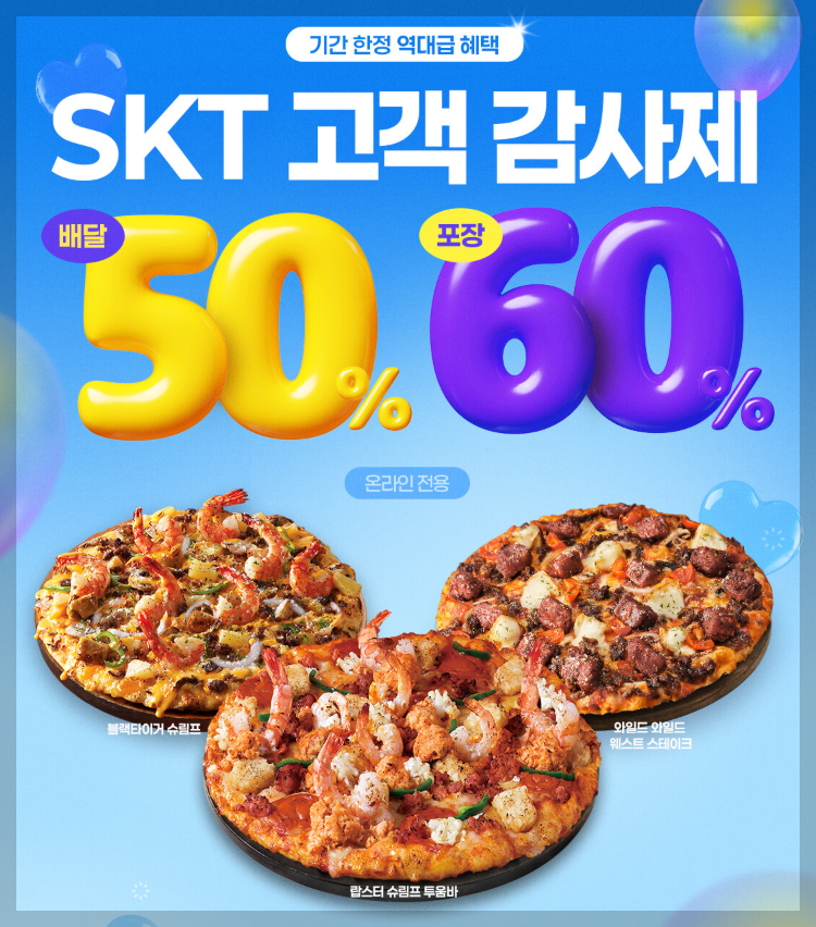 이번 SKT 도미노피자 할인 혜택은 두 가지로 나뉩니다. 배달 시 50% 할인(최대 2만 5천 원), 포장 시 60% 할인(최대 3만 원)입니다.