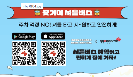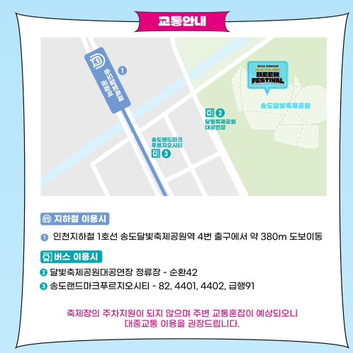 자가용 이용 시에는 혼잡이 예상되므로 대중교통 이용을 권장합니다. 송도맥주축제 입장은 무료이며, 맥주와 음식, 일부 체험 프로그램은 별도 비용이 발생합니다.