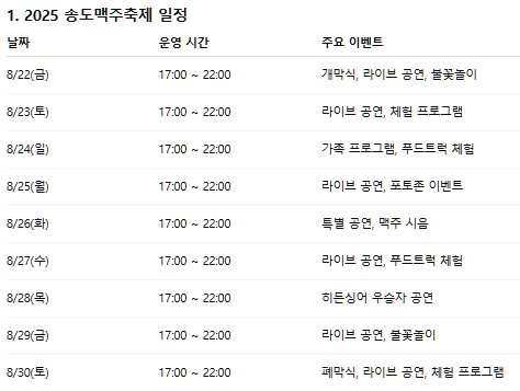 방문 전에 송도맥주축제 일정을 확인하고, 체험 프로그램과 라인업 정보를 참고하면 더욱 알찬 축제 경험이 가능합니다. 송도맥주축제는 올여름을 시원하게 즐기고 싶은 분들에게 꼭 추천드립니다.