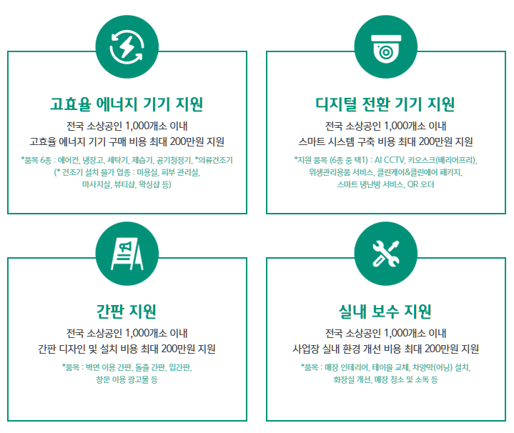 이 사업은 전국 소상공인 1,000개소 이내로 한정해 진행되며, 고효율 에너지 기기, 디지털 전환 기기, 간판 설치, 실내 보수 등 4가지 분야에 각각 최대 200만 원까지 지원합니다.