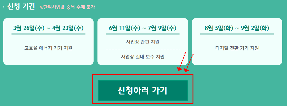하나 파워온 지원사업은 품목별로 신청 기간이 나누어져 있습니다. 고효율 에너지 기기 지원은 3월 26일부터 4월 23일까지, 간판 지원과 실내 보수 지원은 6월 11일부터 7월 9일까지, 디지털 전환 기기 지원은 8월 5일부터 9월 2일까지 진행됩니다.