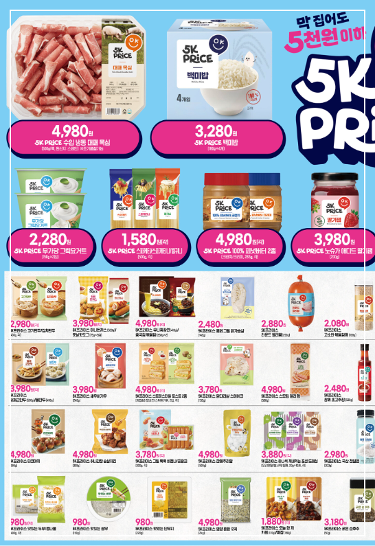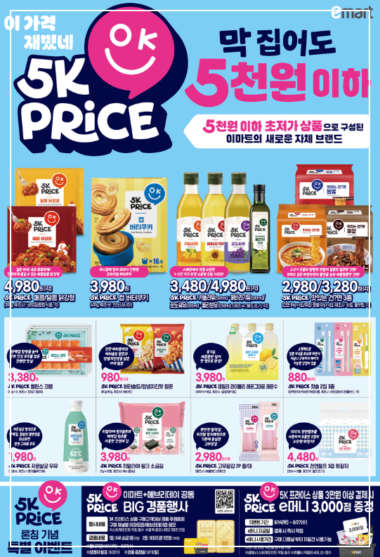 이번 이마트 전단광고에서는 5천 원 이하 상품을 모은 자체 브랜드 오케이 프라이스도 소개됩니다. 가공식품과 일상용품을 중심으로 880원부터 4천980원까지 다양한 저가 상품이 마련되어 있습니다.